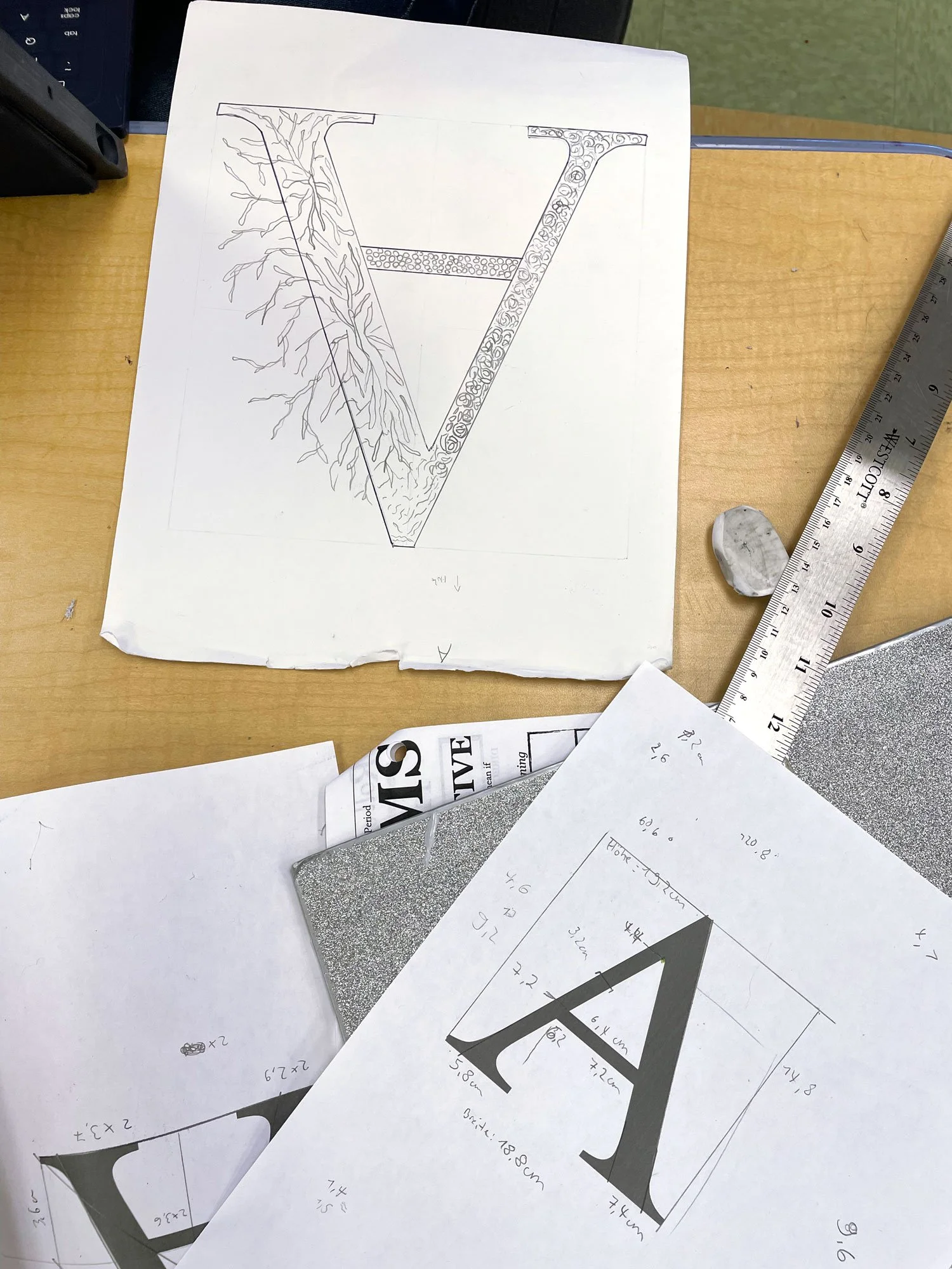 This brings us to the next topic: books and typography. Students learn about the history of writing and copying books and about medieval initials used in precious books hand written and painted in monasteries. We also learn about the invention of book printing and the development of different font types and explore the expression and information inherent in different fonts. Based on this, students choose a capital letter in a specific font that they feel reflects the character of their mystic creature and enlarge this by hand, learning to pay attention to the proportions and forms of all the details of this letter. They then take inspiration from the medieval initials and design their own for the publication of their fable or story.