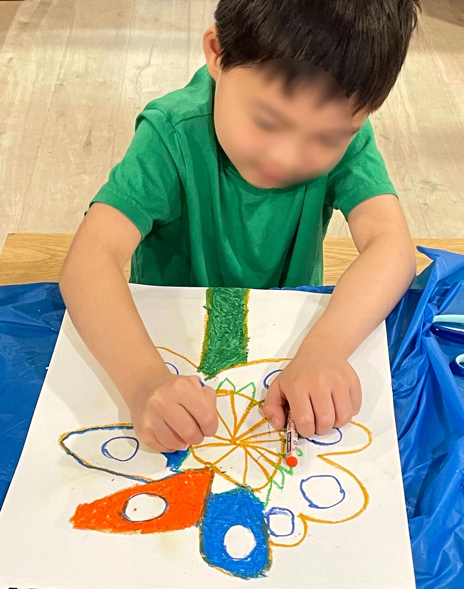 We first looked at a colorful flower bouquet and students observed with all their senses how all these flowers are different in so many ways - color, size, number, shape and position of petals, smell, texture, surface etc… Students could also observe that the more diverse and colorful the flowers in the bouquet the more interesting and beautiful it appeared - just as they as a group consist of many very different individuals, with their uniqueness adding to the livelihood of their group. After some flower related mindful movement they filled out a “care instruction” for themselves - envisioning themselves as flowers and reflecting on their character traits and needs. They also made a first sketch of their flower. This was followed by painting this flower, exploring and experimenting with a variety of techniques - from ink and watercolor to oil pastels and pencils and even using three dimensional elements. Cutting out their flowers also trained their fine motor skills. Together we arranged all the flowers to a beautiful group bouquet on a big poster.